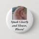 Un perno con una imagen de una mano detrás de un oído y de las palabras, "hable claramente, habla lentamente, por favor!"