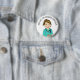 Preséntese a sus pacientes con este botón de fácil lectura. Dibujo personalizado de una enfermera de morena con matorrales verde azulados.