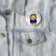 Preséntese a sus pacientes con este botón de fácil lectura. Dibujo personalizado de una enfermera de morena con matorrales azules.