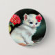 Botón con un gatito blanco. Mientras el gatito mira fijamente con los ojos azules, las flores rojas adornan sus oídos. Un jarrón de rosas rojas se sienta al lado del gatito blanco. ¡Un regalo maravilloso para los amantes del gato y del arte victoriano!