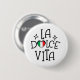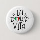 Italy button featuring the stylish La Dolce Vita quote and a vibrant Italian flag heart. This cute Italy pin is a perfect accessory for your denim jacket, backpack, or camera strap. A budget-friendly Italy souvenir button that makes a great party favor for an Italian-themed bridal shower or birthday. Show off your Italian pride with this small but bold heart flag pin.
