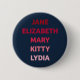 Botón que muestra los nombres de las hermanas Bennet en diferentes tonalidades de rosa del Orgullo y Prejuicio de Jane Austen: Jane, Elizabeth, Mary, Kitty y Lydia. Gran botón para los amantes de los libros y fans de Jane Austen. © Bookish y WonMart