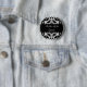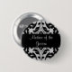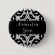 Una madre del botón del alfiler en un hermoso patrón de damasco negro y gris.
