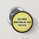 Botón gracioso con un meme "Queridos extranjeros, por favor, llévame de aquí". Fondo amarillo, texto negro.