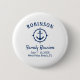 Un botón de reunión familiar con temática náutica, mostrando orgullosamente su nombre familiar, fecha de reunión y ubicación en un elegante guión de caligrafía con un elegante texto moderno. Este diseño presenta obras de arte de un ancla de un barco personalizado con un borde estilo brújula en azul marino sobre blanco o personalizar fácilmente el fondo a cualquier color deseado.