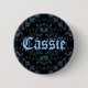 Hermoso diseño intrincado en negro y azul sobre un botón que dice "Cassie" en él. Puede reemplazar este nombre por el suyo propio.