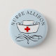 Este botón muestra una gorra de enfermera con una cruz sobre ella y un florecimiento decorativo debajo. Arriba está el nombre de una enfermera para que lo personalizes. El fondo es azul pálido, pero se puede personalizar. Perfecto para una enfermera o un graduado de la escuela de enfermería.