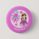 Un botón bonito chica de cumpleaños de princesa personalizada que presenta a una hermosa niña en un vestido de pelota de reina con arcos rosados parados frente a un castillo rosa y azul hielo. Un lindo regalo de fiesta personalizado para una niñita. Agregue el nombre de su hijo debajo de los pasos del castillo de este diseño de cuento de hadas.