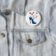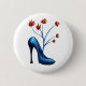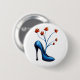 Botón de zapato de tacón alto con un ilustracion digital de un zapato azul con flores creciendo de él en azul, naranja vibrante y fondo blanco personalizable. Diseño de moda con un toque de humor para un chica elegante de moda.