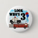 Un crucero de la policía, un motor de bomberos, globos y un texto que dice "Mira quién tiene 3" aparece en nuestros héroes cotidianos camisetas de diseño de cumpleaños, tazas, tarjetas, pegatinas, botones de cumpleaños y más.