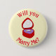 ¿Qué novedosa forma de proponer al que amas? Un botón/insignia lindo con las palabras 'Te casarás con mí' escritas en rojo con un anillo en un gráfico de una caja en un fondo beige. Las palabras se pueden cambiar para adaptarlas a sus necesidades.