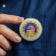 The design features a classic American flag centered within a bold royal blue ring. Encased in a brilliant gold-style sunburst and surrounded by a ring of 20 elegant gold stars, this button offers a premium, official appearance that stands out on any garment.