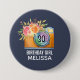 Botón chica de cumpleaños personalizado con un ilustracion acuarela de una cámara naranja y un ramo de flores sobre la parte superior. Las flores del ramo son rosa claro y naranja con hojas verdes, un arreglo floral bonito.