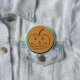 Un botón redondo de madera con un diseño de calabaza tallada en forma de linterna con un contorno azul brillante.