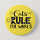 Fun and lovely modern yellow button featuring a cute cat with the caption "Cats rule the world", decorated with white whiskers, cat scratches, a tiny mouse, and a little paw.