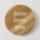 Puedes personalizar este texto o mantener las palabras inspiradoras "Jesús te ama". Este botón de fe cristiana está escrito en un elegante y moderno guión blanco sobre un falso degradado dorado. Este shimmer se simula con tostadas y crema. Este elegante botón personalizado de moda se puede personalizar con un nombre u otras palabras clave. También se puede pedir en grandes cantidades para un regalo para ocasiones económicas. Sería un gran regalo para la Pascua o para los Navidades. Su objetivo es animar a niños y adultos a que sean amados por Jesucristo con un amor eterno. Ver otros diseños en esta colección de expresiones cristianas y de dichos religiosos. Ideal para una iglesia cristiana o para un evento de damas religiosas, regalos de la escuela dominical, favores de la escuela de la Biblia.