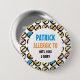 Botón Personalizado de Alergias a Múltiples Alimentos para Niños. Patrón de símbolos alérgicos a los alimentos - sin nueces, sin cacahuetes, sin gluten, sin pescado, sin lácteos y sin huevos con líneas negras en un fondo blanco. El centro tiene un círculo blanco con texto para agregar nombre y alérgenos. El botón de alerta de alergia a los alimentos se puede conectar a las cajas de comida, bolsas de libros, botiquines de medicamentos para alertar a las alergias o localizar la epinefrina. Diseños de Lil Allergy Advocates www.lilallergyadvocates.com