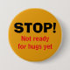 Moderno botón de gamboge amarillo con un simple mensaje que dice STOP, NO LISTO PARA ABRAZOS AÚN en tipografía roja y negra. El texto rojo es PERSONALIZABLE, ¡así que puedes crear tu propio mensaje personal de 'Mantener alejado'! Una manera ideal de aclarar el dilema del abrazo o codo. Disponible en otros colores.