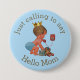 La pequeña mamá de la fiesta de bienvenida al bebé del príncipe del vintage de encargo lindo hola abotona para las duchas de los bebés con un ilustracion hermoso del vintage de un bebé lindo y adorable con la corona azul elegante del pañal y del oro. ¡Él está hablando en un teléfono retro rojo viejo que dice hola con su mamá! ¡Él está sosteniendo una pequeña maleta azul y su oso de peluche peculiar se está inclinando contra ella - para arriba lo embalan todo y alista para su llegada! El fondo es un color azul bonito con el texto gris. Con clase, moderno, contemporáneo, elegante, de moda, diversión, de moda, divertido, divirtiendo, plantillas de encargo chistosas, caprichosas, asequibles del botón. Si usted necesita alguna ayuda que modifica su producto para requisitos particulares me entra en contacto con por favor a través de mi tienda y me placeré ayudar. Tengo productos a juego en mi tienda.