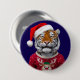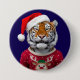 A Christmas button featuring a tiger wearing a Christmas sweater and Santa hat.