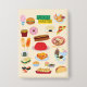 Un arte vectorial de diferentes variedades de comida como algodón de azúcar, hamburguesa, gambas fritas, gyoza, pizza, patatas fritas, hotdog, donut, corndogs, gelatina, ramen, lasaña, sundae, helado, muffin, nachos, mochi, sushi, sandwich, bola de arroz, y taco.