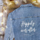 ¡Haz una declaración con esta chaqueta de denim personalizada para la boda! Con la frase "Feliz para siempre" en una fuente de letra cursiva elegante, esta plantilla se puede personalizar con los nombres de la pareja, fecha de la boda, ubicación o cualquier texto que elijas. ¡Un regalo considerado y elegante que la novia amará! Colores impresos: blanco sobre denim azul.