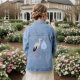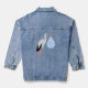 Esta impresionante chaqueta de denim presenta una imagen gráfica de una linda cigüeña blanca con plumas de cola negra sujetándose a un paquete azul pálido de mantas. Hay un texto azul en el bulto que dice "Baby Boy". Este diseño es perfecto para celebrar a un bebé.