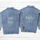 Chaqueta de denim lindo para los amigos de la novia y las damas de honor en su despedida de soltera. En la parte posterior se muestra "El Fiesta" en un guión blanco de moda y un corazón y "Austin, TX" en una tipografía blanca moderna y simple. Puede cambiar el destino del fiesta. Una chaqueta "The Bride" de coordinación está disponible para la novia.