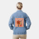 Un insecto rojo y amarillo está rodeado por un crisantemo y una flor naranja brillante. Una joya está colgando de la flor.