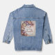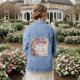 This jacket features a circular floral wreath design with a soft aesthetic. The wreath is composed of white garden roses, pale pink roses, lavender roses and cream-colored flowers arranged in a circular pattern. Baby's breath creates a soft, ethereal background texture throughout the wreath. The center of the wreath contains elegant script in rose gold that reads Faith makes things Possible. The background is a soft, gradient gray color that transitions from light to darker tones. Small golden stars and sparkles are in the image, creating a magical, ethereal effect. The wreath is framed by a golden circular border like the curve of the arrangement. The composition has a dreamy, inspirational quality with soft pinks, lavenders and creams color palette. The denim jacket is made of 90% Cotton/6% Polyester/3% Rayon/1% Spandex.