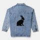 La chaqueta de denim de esta mujer tiene el perfil lateral de un conejo sentado en una silueta negra con un ojo rosa y un anillo de pétalos de flores coloridos alrededor de su cuello.