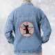 Esta chaqueta de denim tiene la silueta de un gato negro sentado que llega a una estrella de oro sobre un pentagrama rojo dentro de un círculo rojo lleno de gris claro. Personalizar el texto con la plantilla.