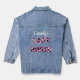 Cree chaquetas de denim personalizadas para fiestas de soltera cuando añada el nombre de la novia a esta chaqueta. El nombre de la novia aparece en la escritura blanca con letras encima de la vaca esconder letras estampadas que deletrean "ÚLTIMO RODEO", lo que lo hace perfecto para tu fiesta de soltera con temática de vaquera en la discoteca.