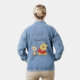 This women’s denim jacket features a soft minimalist illustration of a yellow bear and a giraffe, designed to express warmth, connection, and gentle emotion.