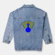Esta impresionante chaqueta de denim presenta a un Navidad brillante y atrevido Peacock usando un sombrero de Santa. El pájaro tiene un vientre azul brillante con una hermosa colección de plumas que se sostienen orgullosamente detrás. Las cucharadas son azules, marrones y verdes. El pavo real tiene grandes ojos negros y un bonito y pequeño pico gris.