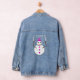 Esta impresionante chaqueta de denim presenta a una linda Navidad muñeca de nieve con un gorra floral rosa bonito y botones rosas. Ella tiene mejillas rosadas y una gran sonrisa. Su palo como los brazos están arriba en el aire y ella está haciendo malabares con bolas de nieve. Hay un texto entre ellos que dice "bolas de nieve". Este divertido diseño seguramente divertirá a todos esta temporada festiva.