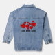 El diseño de amor de los corazones rojos en la parte posterior de esta Chaqueta Denim con texto de personalizable para cambiar o borrar. Seleccione su tamaño adecuado en el menú desplegable.