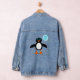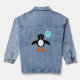 Esta impresionante chaqueta de denim presenta un lindo personalizado de un pingüino azul con ojos azules, un pequeño pico naranja y una panza blanca. El pingüino sostiene un globo azul en polvo. Hay un texto azul pálido en el globo que dice "Niño chico". Este es el regalo perfecto para celebrar a un bebé.