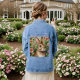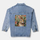 La chaqueta de jean Rubor Blooms & Bunny Dreams cuenta con un conejo de acuarela blanco y bronceado, rodeado de flores rosa pastel y hojas verdes exuberantes, que le confieren un toque delicado y reconfortante a su armario de primavera.