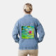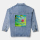 Un lirio de agua fucsia con follaje verde limón en agua turquesa flotando sobre esta chaqueta de denim.