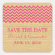 Moderno y de moda Chevron Rústico Salven a los Pegatinas Date con un fondo de textura de madera impresa en arte digital y un patrón de zag zig de rayas de chevron magenta. Este diseño es perfecto para anunciar una boda rústica y elegante. Fácil de personalizar, simplemente añada los detalles de su boda. Haga clic en "Personalizar" para encontrar más opciones de personalización.