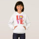 Echa un vistazo a Chibi Supergirl dentro de un corazón de ping que representa la "O" en este logo apilado de "LOVE".