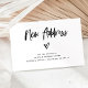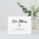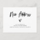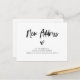 Estas tarjetas postales de anuncio de mudanza en blanco y negro presentan una escritura moderna y casual que dice "nueva dirección", junto con un corazón dibujado a mano. Hay más espacio en la parte posterior para agregar notas adicionales. Un diseño simple y elegante que es la forma perfecta de hacer saber a amigos y familiares que se ha mudado.