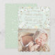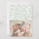 Tarjeta de Navidad adorable para las primeras fiestas de tu recién nacido. Fondo verde menta con flores y ramitas lindas en blanco, y una ilustración de patrón floral amarillo. Dice "Cambiamos las noches silenciosas por un paquete de alegría" en fuentes elegantes manuscritas. Personalízala con el nombre de tu familia. Algunos elementos por Sweet Shop designs.