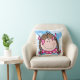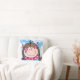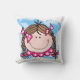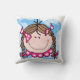 Una chica de pelo marrón con trenzas y un collar de flores rosadas y arcos rosados en su cabello sobre una almohada de fondo azul.