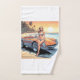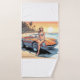 Un retrato moderno de un chica encantador, con un coche deportivo, en un hermoso paisaje de mar y playa, con colores cálidos al atardecer. Gráfico informático