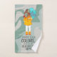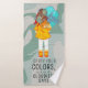 Chica con paraguas en un juego de toallas de cotizaciones positivas para el viento. Este dibujo retrata a una chica parada en el viento, su espalda giró hacia el espectador. Ella sostiene un paraguas. El pelo del chica está siendo soplado en el viento. El texto positivo dice "Lleva tus colores incluso en los días más nublados".