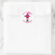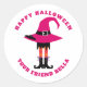 Chica de brujas burguesa de moda con un elegante gorra de brujas rosa, medias rayadas y zapatos de bruja negros con cordones morados atados en un arco. Perfecto para una escuela o para una fiesta de Halloween en casa. Un bate decora a su gorra.