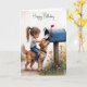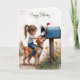 Sentada en la espalda de un perro, una niña se acerca para colocar un pedazo de correo en un buzón azul rodeado de flores silvestres vibrantes