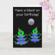 Dos mujeres alienígenas, con fiestas y gorras, dicen "Ten una explosión en tu cumpleaños" y "¡Espero que salga de este mundo!"